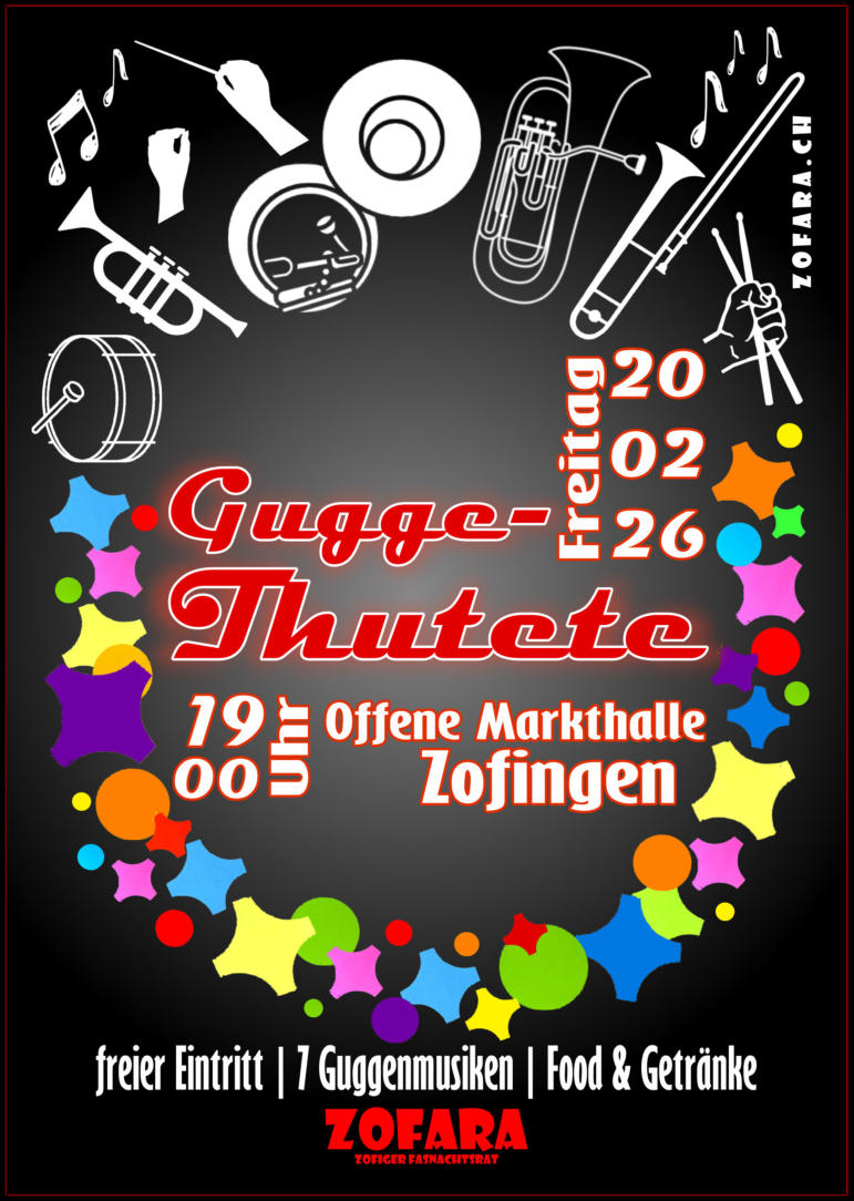 Die fünfte Ausgabe der Gugge-Thutete erscheintnach der letztjährigen Premiere im selben Rahmen. Mit der alten Idee, aber einem neuen Konzept, organisieren wir wiederumeinen Fasnachtsauftakt in Zofingen.Erneut findet der Anlass in der Offenen Markthalle statt.Die Guggen-Bühne stellen wir wieder unter den Dächern der Markthalle auf,die Food- und Getränke-Ecke der einheimischen Fasnachtsvereinefindet ihr ebenfalls wieder vor Ort.Den Abend organisiert als Hauptverantwortlicher der ZOFARA,mit geschätzter Unterstützung der Wagenbauer Eclunawabaund der Guggenmusik Langnase Zofige.Mit dabei sind in diesem Jahr nebst dem Zofinger Stadtratdie folgenden 7 Guggenmusiken:Langnase ZofigeBöögge Brätscher WelschenrohrWybergschränzer AarauFürobe-Blooser SelzachVentil-Blöterler BiberistTruubeschränzer AarburgGugge Rohrspatzen ThalDer Event startet um 19:00 Uhr.SAVE THE DATE: Freitag, 20.02.2026