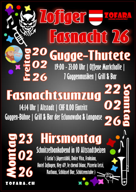 Hier findet ihr das Programm der Zofiger Fasnacht 2026.